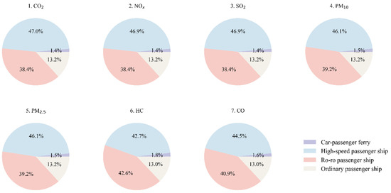The similar HC emission contributions of high-speed passenger ships and Ro-Ro passenger ships may have been due to the commonality of the operating characteristics and fuel usage of the two types of ships. First, high-speed passenger ships and Ro-Ro passenger ships are usually equipped with similar medium speed diesel (MSD) engines, which tend to produce a higher proportion of unburned hydrocarbons (HCs) when operating at low loads. Although there were significant differences between the two types of ships in the emission of other pollutants such as CO2 and NOx, HC emissions are more sensitive to changes in combustion efficiency. Incomplete engine combustion during low-load and idling operation will lead to increased HC emissions, which is a common operating condition during the berthing, unberthing, and low-speed sailing phases of high-speed passenger ships and Ro-Ro passenger ships.