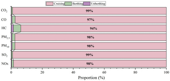 Based on previous studies, the passenger ship emissions in the Zhoushan area were categorised into four operating modes (berthing, anchoring, unberthing, and cruising) to investigate the characteristics of the emissions under the different modes. The proportions of emissions from each mode are shown in Figure 10. The results indicated that, unlike other types of ships such as cargo ships, tankers, and fishing vessels, passenger ships generated 97% to 99% of their emissions during the cruising phase. This aligns with the operational characteristics of passenger ships, which spend most of their operational time in cruising mode and have relatively short anchoring durations. These findings are also consistent with the conclusions of Peng et al. [61]. It is hypothesised that, under normal circumstances, passenger ships powered by dual main engines shut off their engines when approaching passenger terminals. They rely on water currents, inertia, and their residual speed to reach the berth and wait for passengers to board and disembark. This operational behaviour differs from those of other ships entering and leaving ports, leading to especially low emissions during the berthing, anchoring, and unberthing phases.