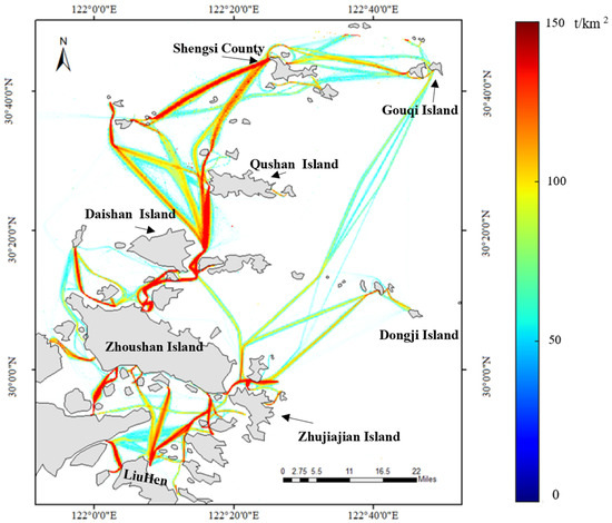 The spatial distribution of the emissions exhibited clear patterns that correspond to the ships’ navigation routes. The emissions along the routes between Daishan Island, Qushan Island, and the Shengsi Archipelago were significantly higher than in other areas. Similarly, there was notable activity on the routes connecting Zhoushan Island with Liuheng Island, Xiazhi Island, and Taohua Island. It is important to note that most passenger ship emissions occurred within designated navigation areas. This can be explained by the nature of passenger ship operations, which primarily serve passenger transport, tourism, and leisure purposes. Before routes are launched, passenger ships will undergo safety risk assessments to ensure compliance with safety requirements. Ships are permitted to only operate in waters that meet passenger safety standards, using routes recommended or designated by administrative authorities, and embark/disembark passengers at designated terminals. In the Zhoushan area, which is crowded with various commercial and fishing vessels, adhering to fixed routes helps reduce the risk of ship collisions and ensures the safety of the passengers onboard.