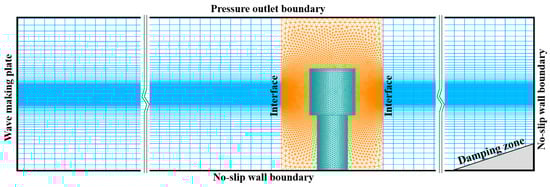 To complement the experimental results and gain deeper insights into the flow characteristics, a numerical model of the hybrid OWC–wind device was developed using the CFD software ANSYS-Fluent 16.0. The numerical setup and the mesh structures are illustrated in Figure 3. In this model, since the waves do not overtop the air chamber and interact with the monopile, the internal cylinder above the OWC chamber was omitted to simplify the calculations. Apart from this, the dimensions of the numerical model remained fully consistent with those used in the experiment. As shown in Figure 3, structured grids were used in the regions near the two sides of the wave flume. The mesh size in length was maintained at less than one-fiftieth the minimum wave length, while the meshes near the free surface were refined to enhance the accuracy of fluid motion capture []. For the hybrid device domain, unstructured grids were employed and interface boundary conditions were applied to connect the different computational domains. In addition, except for the top of the wave flume, which was set as the pressure outlet boundary, all other boundary conditions were set as no-slip walls. A user-defined function (UDF) was employed to control the motion of the wave-making plate for wave generation. The velocity of the wave-making plate v can be written as