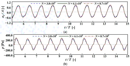 To ensure modeling accuracy and reduce computational cost, it is necessary to perform convergence verifications for the mesh size and time step of the numerical model. It has been demonstrated that, once the mesh reaches a certain number, the improvement in accuracy becomes negligible, while the computational time increases significantly. The case with a wave height H = 0.1 m and wave period of T = 1.63 s was selected for verification. Figure 4a,b present the mesh convergence study for the free surface elevation and air pressure inside the air chamber. Three different sizes of mesh refinement zones were set, with the mesh sizes in the vertical direction corresponding to 1/5, 1/10, and 1/20 of the wave height. The corresponding numbers of mesh cells were N = 3.8 × 105, 6.1 × 105, and 8.7 × 105, respectively. The time step was set as Δt = 0.0025 s. As shown in Figure 4, the relative free surface elevation aI/A (where aI and A represent the instantaneous elevation inside the chamber and the incident wave amplitude, respectively) and air pressure variations p for N = 3.8 × 105 are much lower than for the other parameters, and the amplitude differences for these two parameters compared to N = 8.7 × 105 are 7.5% and 9.3%, respectively. For N = 6.1 × 105, the differences are 1.3% and 1.6% when compared to N = 8.7 × 105, but the computational time was reduced to 64%. Therefore, a mesh number of N = 6.1 × 105 was chosen for the subsequent calculations.