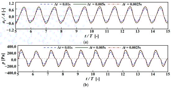 Convergence study of the time step. (a) Free surface elevation; (b) air pressure.