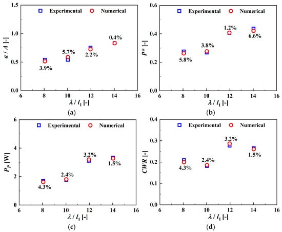 The hydrodynamic performance of the hybrid OWC–wind device is demonstrated and compared in Figure 6. As is evident from Figure 6a, the relative amplitude of the free surface elevation a/A (where a represents the average elevation amplitude) increases as the incident wave length increases, indicating that long-period waves are more likely to enter the chamber and induce oscillations. Additionally, the numerical results closely match the experimental results, with an average error of 3.1% across the different conditions. Figure 6b presents the dimensionless air pressure amplitudes inside the chamber, where P* = P/ρgA and P represent the average pressure amplitude. Both the experimental and numerical results demonstrate similar trends, with an average error of 4.4%.