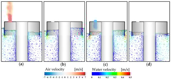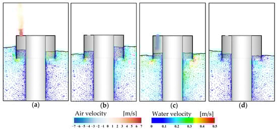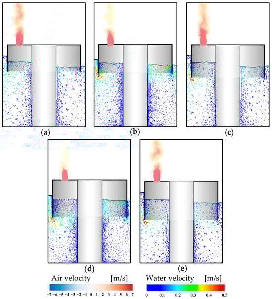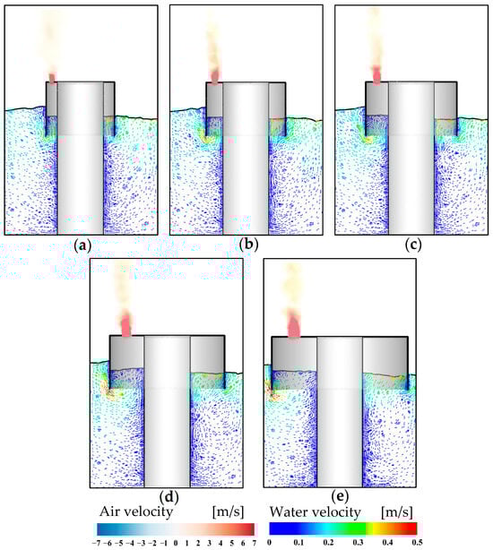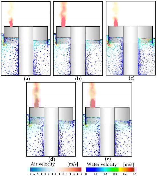 Figure 12 presents the flow characteristics of the device under the effects of PTO dampings. Evidently, when the orifice opening is small (see Figure 12a,b), the free surface elevation inside the air chamber is lower due to the significant PTO damping, which restricts the oscillation of the water. At the same time, the free surface fluctuations become more pronounced with larger PTO damping. As the orifice opening increases, see Figure 12c–e, the damping effect diminishes and the velocity of the water particles inside the chamber increases, which leads to a higher free surface elevation. Additionally, in the case of small damping, the airflow is more easily expelled from the chamber.