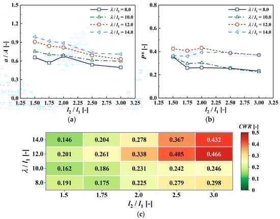 Figure 9 shows the effect of the chamber diameter on the hydrodynamic performance of the hybrid OWC–wind device. Evidently, both the free surface elevation and air pressure decrease as the chamber diameter increases. This is attributed to the more intense free surface fluctuations inside the chamber at larger diameters, resulting in higher energy dissipation, as demonstrated in Figure 8. The CWR of the device is presented in Figure 9c. Although the free surface elevation and air pressure decrease with increasing diameter, the OWC with a larger chamber has a greater free surface area, which enhances the airflow generated during the energy conversion process, ultimately leading to a higher CWR. The maximum CWR is observed at 0.466 when the relative diameter l2/l1 = 0.3.