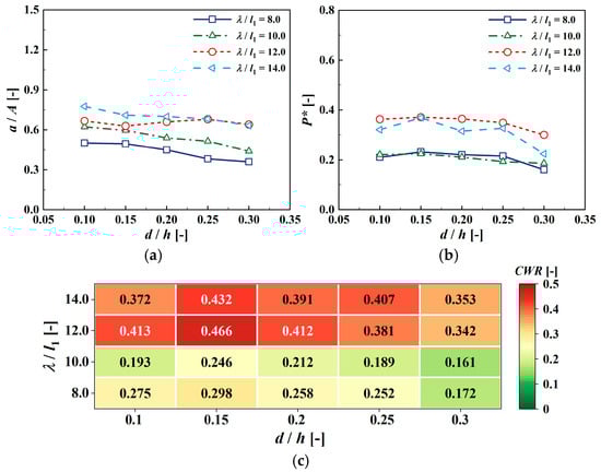 The effect of the chamber draft on the hydrodynamic performance is presented in Figure 11. Generally, the free surface elevation decreases as the chamber draft increases because the waves are obstructed from entering the chamber at larger drafts, which is consistent with the trend observed in Figure 10. Regarding the air pressure, the amplitude values are closer under the two smaller-wave-length conditions. As the chamber draft increases, the air pressure rises and then decreases, with a sharp drop observed at the relative draft of d/h = 0.3. As for the CWR in Figure 11c, it can be concluded that the chamber draft has a significant impact on the performance of the hybrid device. An appropriate draft can effectively improve the energy capture performance of the device. When the relative draft d/h = 0.15, the OWC achieves the maximum CWR at 0.466. Additionally, the hybrid device is sensitive to the wave length, and the optimal performance is observed at a relative wave length of λ/l1 = 12.0.