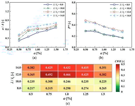 Figure 13 shows the hydrodynamic performance of the hybrid device at different PTO damping levels. From Figure 13a,b, the PTO damping effect gradually decreases as the orifice opening increases, enabling the air inside the chamber to more easily exchange with the external environment, which leads to a decrease in the air pressure inside the chamber and consequently an increase in the free surface elevation. Since the air power is the product of the pressure and airflow rate and the variations in these two parameters with respect to PTO damping are opposite, there theoretically exists an optimal PTO damping that maximizes the air power. The CWR is shown in Figure 13c. Except for the relative incident wave length λ/l1 = 14.0, the optimal CWR occurs at α = 0.75%, with a corresponding maximum value of 0.492.