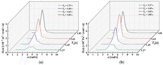 The spectra of the free surface elevation and air pressure inside the chamber, obtained using the fast Fourier transform (FFT) method, are illustrated in Figure 15. The frequency-domain results of the spectral analysis were derived from the transformation of the time-domain data, i.e., the time series of the parameter in irregular waves. As shown in Figure 15a, both the spectral moment and peak of the free surface elevation increase with the significant period as more wave energy enters the air chamber during longer periods. Furthermore, a second-order spectral peak is observed when TS = 1.27 s, which may be attributed to the more intense interaction between the waves and the device during shorter wave periods, leading to significant free surface fluctuations inside the chamber. The air pressure spectrum is shown in Figure 15b, and the maximum spectral peak occurs at TS = 1.63 s, indicating that the air pressure inside the chamber is higher at this condition.