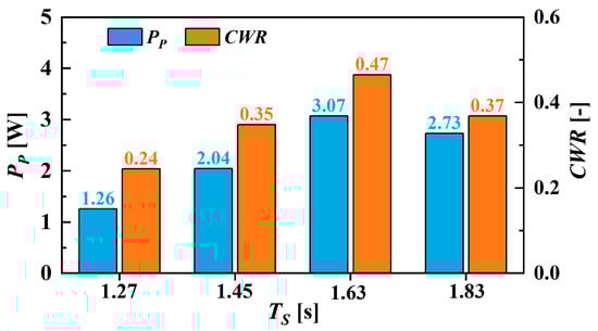 Figure 16 presents the pneumatic power output and the CWR of the hybrid device in irregular waves. Both the power output and CWR show a trend of first increasing and then decreasing with the significant wave period, reaching a peak at TS = 1.63 s. The peak pneumatic power output and CWR are 3.07 W and 0.47, respectively. These results reveal that the hybrid device exhibits more pronounced resonance effects with the irregular wave scenario at the specific period. Therefore, the device could be optimally designed based on the dominant wave conditions to capture more wave energy.