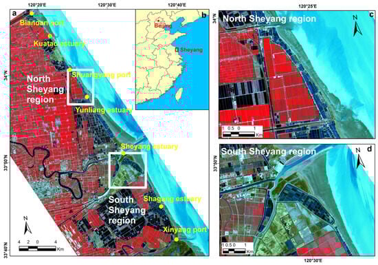Location of the research area ((a): Location of Sheyang County and various ports/estuaries, (b): Location of Sheyang County along the coast of China, (c): North Sheyang Region, (d): South Sheyang Region. The base map is a Sentinel-2 image acquired on 5 August 2020, and the false color composition is based on bands 7, 4, and 3).