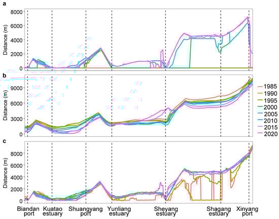 Interannual variation of offshore distance with different boundary lines (based on the 1985 land artificial coastline, (a): land artificial coastline, (b): water boundary, (c): vegetation front edge).