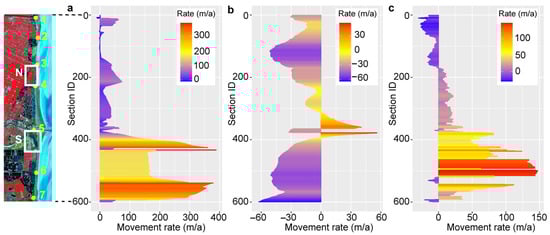 Average movement rate of different boundary lines from 1985 to 2020 (The left map is a Sentinel-2 image acquired on 5 August 2020, and false color composition is based on bands 7, 4, and 3. Numbers 1 to 7 represent the Biandan port, Kuatao estuary, Shuangyang port, Yunliang estuary, Sheyang estuary, Shagang estuary, and Xinyang port, respectively. Rectangles N and S represent the North Sheyang region and the South Sheyang region. Section ID from small to large represents the Sheyang section from north to south, (a) land artificial shoreline, (b) water boundary, and (c) vegetation front edge).