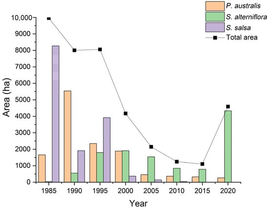 Between 1985 and 2020, the total area of salt marsh vegetation in Sheyang County showed a decreasing trend. However, from 2015 to 2020, the total area showed a slight increase, primarily driven by the rapid expansion of Spartina alterniflora. Prior to 1995, Phragmites australis and Suaeda salsa were the dominant salt marsh species in Sheyang County. Their areas declined sharply after 1995 due to extensive reclamation activities and the aggressive spread of Spartina alterniflora (Figure 4). At present, the salt marshes in Sheyang County are predominantly composed of Spartina alterniflora.
