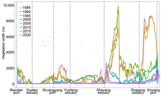 The vegetation width distribution from Biandan port to Sheyang estuary was relatively narrow, generally below 2000 m, and exhibited a trend of initial increase followed by a decline over time. The widest distribution occurred around the year 2000. From Shuangyang port to Yunliang estuary, the vegetation width showed a decreasing trend, with a particularly sharp reduction observed from 1985 to 1995. In contrast, the vegetation width from Sheyang estuary to Xinyang port was relatively larger, with most areas exceeding 2000 m prior to 1995. However, the vegetation distribution width from the Sheyang estuary to the Shagang estuary displayed an increasing trend from 1985 to 1995, followed by a decline thereafter. Similarly, the vegetation distribution width from Shagang estuary to Xinyang port decreased over time, with a notable reduction occurring from 1990 to 1995 (Figure 5).