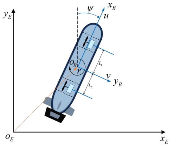 The coordinate system selected in this paper is shown in Figure 1. Two Cartesian reference frames are defined to describe the motion of AUVs: namely the earth-centered inertial frame and the body-fixed reference frame . In this study, the horizontal motion of the AUV is described, which means that the vertical and roll motions are ignored.