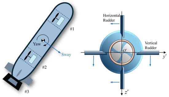 As shown in Figure 2, two auxiliary thrusters, one main thruster, and cross-rudders provide the force and torque required for the AUV’s horizontal motion. In this study, the thrust of the AUV is generated by the thrusters (#1–#3) to achieve the surge, sway, and yaw motions, while the yaw moment can be jointly generated by the thrusters and rudders. Due to the symmetrical installation of the cross-rudders, the origin of the hull coordinate system in Figure 2 coincides with the center of gravity of the AUV. Meanwhile, the upper and lower surfaces of the vertical rudder are considered as one rudder.