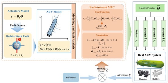In this section, the actuator faults are transformed into controller constraints and a fault-tolerant MPC controller for the cross-rudder AUV is constructed as in Figure 3.
