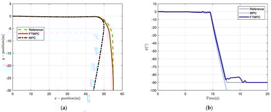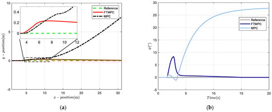 Figure 7a shows the global motion trajectory of the AUV. AUVs using both methods can smoothly achieve heading control before the rudder fault occurs. After changing the reference heading angle, the AUV using the proposed method performs a turning action at approximately 45 m to achieve fault tolerant control. At approximately m, tracking of position and heading is achieved using an AUV with FTMPC. After a fault occurs, the yaw angle deviation of the AUV using traditional MPC is generated starting from m.