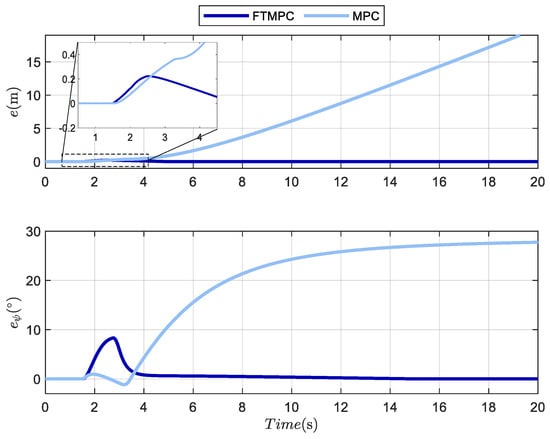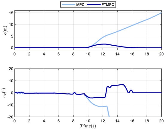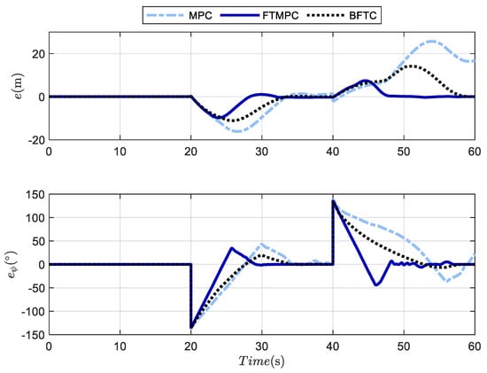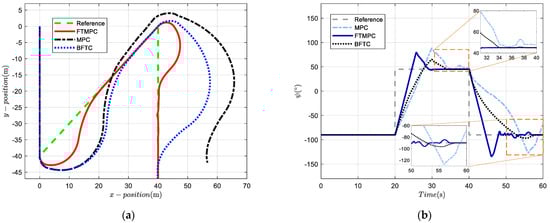 As illustrated in Figure 11, the conventional MPC does not achieve convergence of the position and heading errors under fault conditions. In contrast, the fault-tolerant method demonstrates better fault handling capabilities, despite a slower convergence rate due to abrupt heading changes. Notably, the maximum position error observed with the FTMPC method is −9.8 m, compared to 16.7 m for the BFTC method, indicating a marked improvement in trajectory accuracy.
