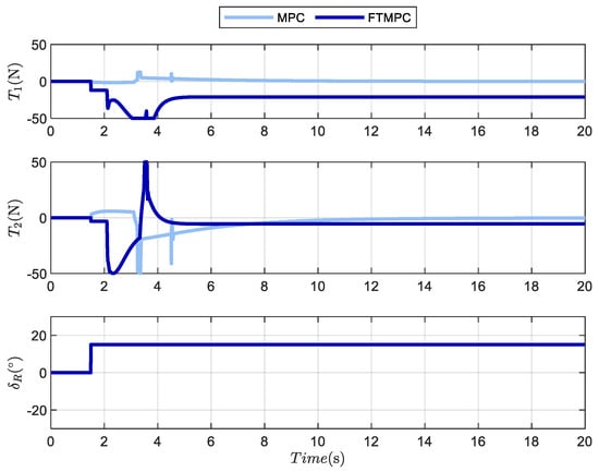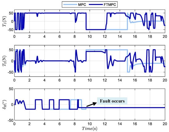 In Figure 9, the variations of the control input value are shown. Initially, the control input differences between the two controllers are minimal. However, between the 8th and 10th seconds, the AUV’s vertical rudder becomes stuck at a fault angle of −10°. The traditional MPC lacks a fault response strategy, preventing it from leveraging auxiliary thrusters to adjust the AUV’s heading angle.
