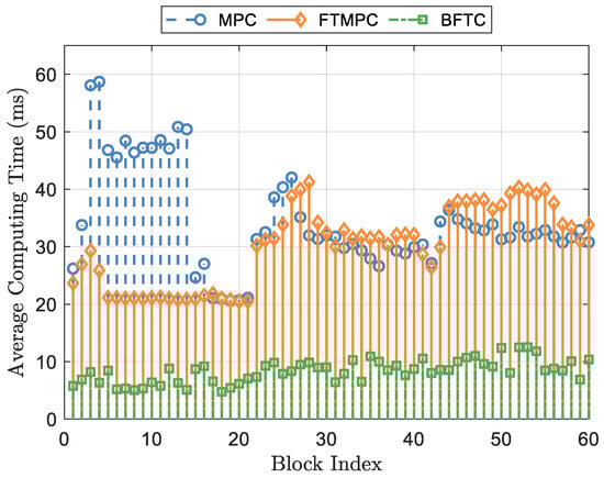 Additionally, the optimization time of the MPC is analyzed, as depicted in Figure 12, which presents the stem plots of computation times for the different methods. Table 2 provides a summary of the performance indicators, including the average computation time and the MPC cost function for various fault-tolerant control strategies under rudder fault conditions. The results indicate that the computation times for MPC and FTMPC are comparable, while BFTC demonstrates superior computational efficiency.