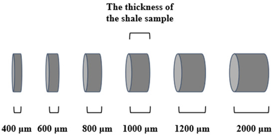 The ion-milled mudstone blocks were tested by Zeiss GeminiSEM450 and FEI Helios Nanolab 650 dual beam FIB-SEM to detect the mineral and organic matter particles and pore spaces with a working distance of 10 mm, following the methods of SEM equipment and sample preparation in prior studies [40,41]. The mineral properties were tested by the Rigaku TTR III diffractometer, while the TOC content was examined by ELTRACsi, presenting the mineral content and the content of organic matter in the examined samples. In the meantime, the samples of each origin were sliced into cylinders, whose thicknesses increased at an interval of approximately 200 μm from about 400 to 2000 μm, which varied with the different conditions of the samples, as can be seen in Figure 1. The minimum thickness of 400 µm represented the finest increment achievable by the cutting machine and was therefore selected as the starting point for the increasing thicknesses. Given that liquid penetrates from both sides of the samples, it was theoretically expected that with each 200 µm increase in thickness, there would be a corresponding 100 µm increase in the depth of water penetration. A final thickness of 2000 µm was chosen, but more samples of larger thicknesses are expected in future studies in case the liquid cannot penetrate. The thicknesses and volumes of the samples are listed in Table 1. The cylindrical samples whose thicknesses were >1400 μm had their flank covered with epoxy adhesive in order to prevent the imbibition liquid from injecting via the flank side. The imbibition liquid in this research was deionized water, reducing the influence of other impurity substances.