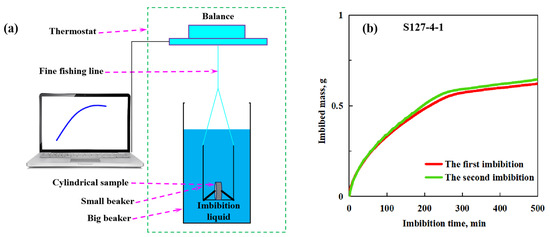 The equipment and repeated group of spontaneous imbibition experiments: (a) the equipment; (b) the repeated group of sandstone sample S127-4-1.
