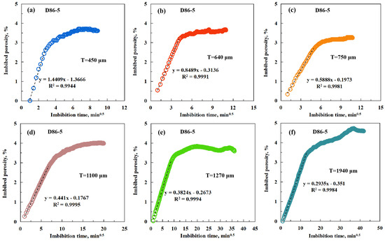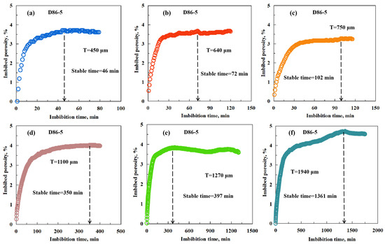Figure 4 illustrates the imbibition curves of sample D86-5 with different thicknesses with the unprocessed time in minutes, with different colors representing the results of different thicknesses. All the curves in Figure 4 show that the imbibed porosity increases rapidly with time, and a stable status is reached in all groups. The stable time of different samples can be affected by many factors, and in this case, it changes with thicknesses [15,48]. In Figure 4a, the stable time of the sample with a thickness of 450 μm is 46 min, which is the smallest in all samples. In Figure 4b–f, the stable time increases with the addition of thicknesses 640 μm, 750 μm, 1100 μm, 1270 μm, and 1940 μm, corresponding to the stable time of 72 min, 102 min, 350 min, 397 min, and 1361 min, respectively.