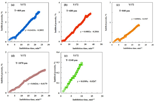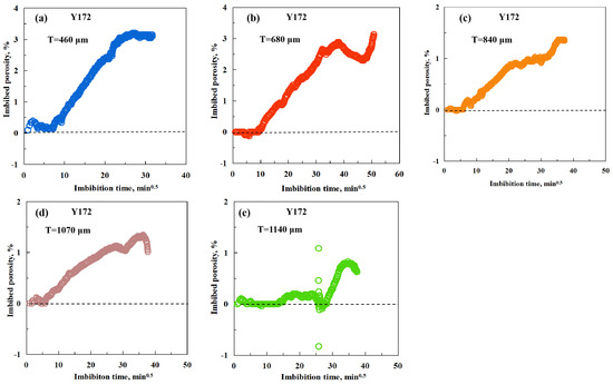 The imbibition curves of sample Y172 with square-rooted time are shown in Figure 7, which includes samples with different thicknesses. The processed imbibition curves reveal more fluctuation in the initial periods of imbibition. In Figure 7a, hardly any imbibition occurs in the initial period, which is mainly caused by the fact that it requires more interaction time between water and rock before liquid fills into shales. In Figure 7b, the initial imbibed porosity is about zero, which indicates that water has scarcely filled into the rock. Likewise, in Figure 7c, the initial imbibed porosity is also approximately zero and then increases gradually. In Figure 7d, the initial imbibed porosity has some fluctuation but is still near zero. In Figure 7e, the interaction time between the water and rock is long before the fluctuation period ends, and then water fills into the rock quickly. From Figure 7a,e, the ultimate imbibed porosity of sample Y172 is 3.1%, 2.8%, 1.4%, 1.3%, and 0.8%, respectively.