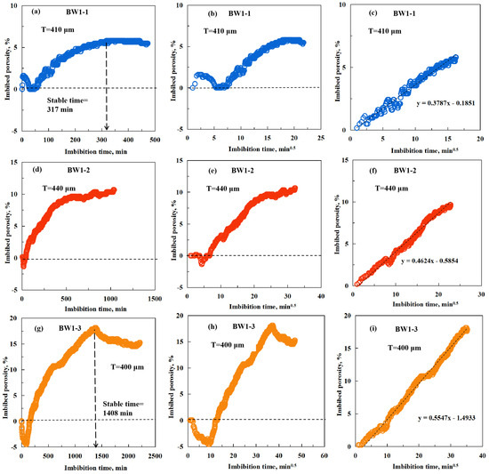 The unprocessed spontaneous imbibition curves, imbibition curves, and modified imbibition curves of different samples: (a–c) BW1-1 with a thickness of 410 μm; (d–f) BW1-2 with a thickness of 440 μm; and (g–i) BW1-3 with a thickness of 400 μm.