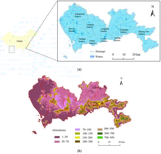 Study area condition. (a) Study area location. (b) Altitude distribution of Shenzhen city.