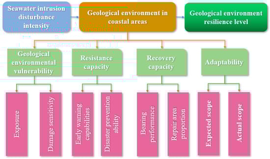Numerous valuable insights are amassed in the analysis of the causes of seawater intrusion, the evaluation of its severity, and the formulation of prevention and control strategies. However, while there have been some achievements in the risk assessment of the geological environment caused by SWI, research on the geological environment resilience (GER) to SWI is not sufficiently explored, with most studies focusing on sensitivity and vulnerability analyses. Because Shenzhen is a coastal city, has a flat terrain and serious seawater erosion, is economically developed and densely populated, and has extensive use of underground space, studying this problem is of significance for protecting the underground space. Therefore, this study takes Shenzhen city as an example. Based on the three basic requirements of robustness, recoverability, and adaptability, we evaluate the geological environment resilience under the influence of SWI by assessing the disturbance factors, vulnerability, resistance capacity, recovery capacity, and adaptability. This study will help to better understand the impact of SWI on the geological environment in coastal areas and provide reference for the prevention and control of seawater intrusion and the protection of underground freshwater resources.