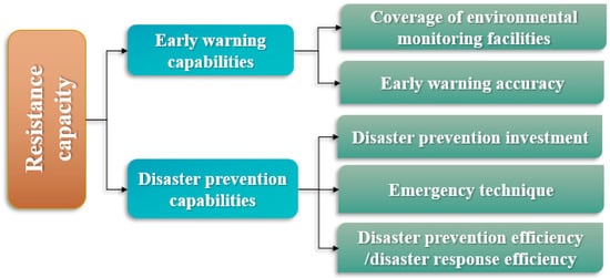 The ability of a city to resist natural hazards, including SWI, is related to its economic foundation, hazard prevention equipment, and response speed [34]. Therefore, the resistance capacity to SWI includes early warning and hazard prevention capabilities. Based on the characteristics of urban early warning and hazard prevention capabilities for geological hazards, a corresponding evaluation indicator system is established (Figure 5). The early warning capability is determined by the coverage rate of monitoring facilities and the accuracy of early warnings, generally taking the minimum value of the two. The hazard prevention capability is determined by investment, hazard prevention technology, and hazard response efficiency, and the hazard prevention capability is calculated using the AHP method. To highlight the importance of early warning capability and reduce the variability of the calculation results, the result of the early warning capability is multiplied by the natural logarithm exponent and the hazard prevention capability result, giving the calculation result of the resistance capacity, as shown in Formula (5):