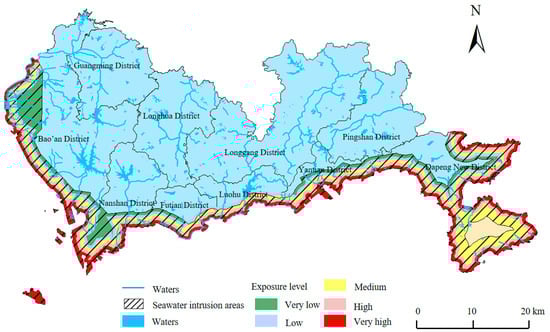 The impact range of SWI includes coastal areas, downstream areas of rivers, and adjacent lands. In coastal areas like coastal plains without significant barriers to prevent seawater infiltration, the influence of seawater can extend up to 2.5 km from the coastline. If SWI affects rivers, the impact of seawater on riverbanks can extend up to 1.5 km from the riverbank. Therefore, the coastal and riverside areas are divided, and the exposed regions are determined using a boundary of 2.5 km from the coastline. A dividing line of 500 m is used, and the exposure assessment is the quantitatively assigned values based on Table 3. Geological environment vulnerability is calculated using Formula (3) and presented in Figure 7. The exposed area of SWI in Shenzhen is 500.16 km2, accounting for 25% of Shenzhen’s total area. Overall, Shenzhen’s coastal and riverside areas are severely exposed, affecting a significant proportion.