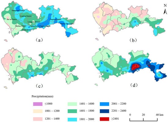 Shenzhen has a subtropical monsoon climate, with a mild climate, abundant sunshine, and rainfall. The average annual precipitation is 1932.9 mm, and 86% of the annual rainfall occurs during the flood season (from April to September). The annual precipitation in all districts generally ranges from 1600 to 2500 mm, and the average precipitation in the whole city is 1995.3 mm. The precipitation is distributed with “more in the east and less in the west”. Yantian, Dapeng, and Pingshan have relatively large amounts of rainfall, basically above 2000 mm, while Guangming, most of Longhua, the northern part of Bao’an, and the northeastern part of Longgang have relatively small amounts of rainfall, below 1800 mm (Figure 2).