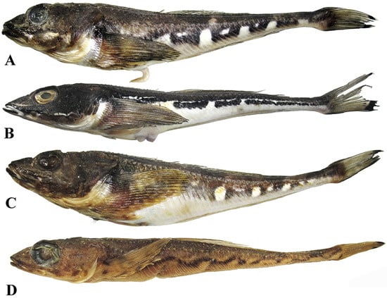 Alaskan sculpin Triglops metopias, habitus. (A) IOM 03660, male, 265 mm SL, fresh colouration; (B) IOM 03660, aberrant male, 230 mm SL, fresh colouration; (C) IOM 03660, female, 215 mm SL, fresh colouration; (D) IOM 03662, male 114 mm SL, formalin-preserved specimen.