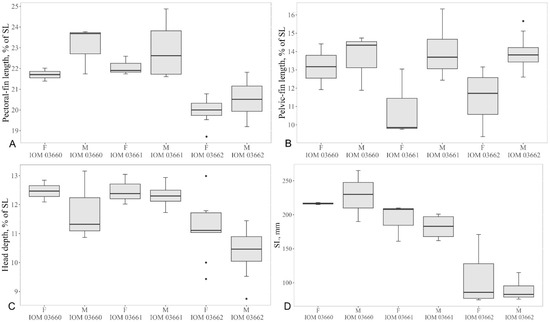 Box-and-whisker plots demonstrate sexual dimorphism in body proportions of Alaskan sculpin Triglops metopias for samples IOM 03660, 03661, and 03662: (A) pectoral fin length; (B) pelvic fin length; (C) head depth, and (D) standard length. The boxes denote median values and 25% and 75% interquartiles; the lower and upper whiskers represent 10% and 90% interquartiles; dots are outliers.