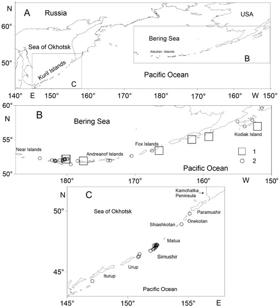 (A) Capture sites of the Alaskan sculpin Triglops metopias (B) off the Aleutian Islands and Gulf of Alaska and (C) off the Kuril Islands; 1—data from [1], 2—unpublished data (NOAA Alaska Fisheries Science Center survey, FishBase [8], USNM, 1951 R/V Vityaz (our data), ZIN (our data), 2017 F/V Anatoly Torchinov (Gordeev, pers. comm.), 2019 F/V Kamlain (Zhukova, pers. comm.), 2019 F/V Anatoly Torchinov (our data)).