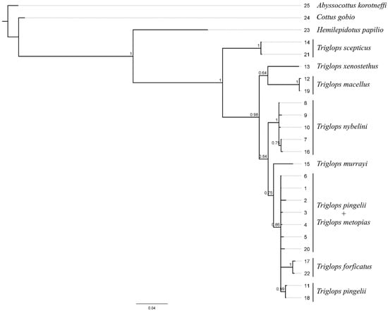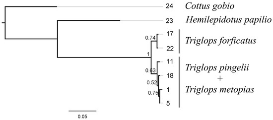 Of the 10 valid members of the genus Triglops, we analysed the Cyt b gene sequences of 8 species (Figure 4). For T. dorothy, the nucleotide sequences are completely absent from genetic databases, as this species was described from museum specimens collected at the beginning of the last century. For T. jordani, NCBI has a single Cyt b gene sequence (GenBank accession number LC 125723.1), which was excluded from our analysis due to the inconsistency of the sequence configuration with our samples. An analysis of the topology of the phylogenetic tree showed that the inheritance of the Cyt b gene clearly distinguished between T. scepticus, T. xenostethus, T. macellus, T. nybelini, and T. murrayi. When the 612 bp-long sequences were analysed, three species fell into common clade, i.e., T. pingelii, T. metopias, and T. forficatus. However, when increasing the sequence lengths to 686 bp (Figure 5), T. forficatus formed a separate clade from T. pingelii and T. metopias.