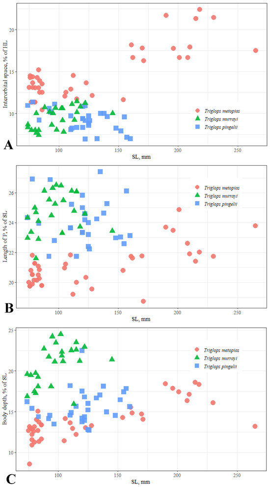 Morphometric differences between three morphologically similar species of Triglops: (A) interorbital width, (B) pectoral-fin length, and (C) greatest body depth.