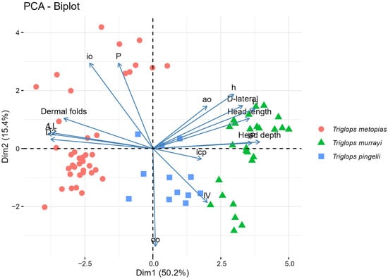 Principal component analysis of the diagnostically valuable counts and measurements statistically confirms the separation of T. metopias from T. murrayi and T. pingelii by both principal components (Figure 7). The PCA of the morphological characteristics produced two axes explaining 65.53% of the total variance (Table 5). The first component (PC1) explained more than 50% of the variability and was positively correlated with the head length, head depth, and pectoral fin length, and negatively correlated with the number of rays in the second dorsal fin and anal fin, number of scales in the lateral line, and oblique dermal folds. Triglops murrayi was positively correlated with axis 1 and was characterised by a relatively high head depth and length and long pectoral fin, whereas Triglops metopias was negatively correlated with axis 1 and characterised by a greater number of rays in the second dorsal fin and number of rays in the anal fin and relatively small head depth and length. The second component (PC2) explained 15.36% of the variability and was positively correlated with the number of rays in the pectoral fin and negatively correlated with the length of the orbit. Mostly, this axis was positively correlated with parts of the Triglops metopias samples. Triglops pingelii was located close to the intersection of the axes and was characterised by larger orbit length and relatively long pelvic fins. The distribution range of T. metopias (North Pacific) and T. murrayi (North Atlantic and Atlantic sector of the Arctic Ocean) is completely allopatric, but the former species is largely sympatric with the circumboreal T. pingelii in the North Pacific. However, although all the diagnostic characters distinguishing the latter species overlap to a greater or lesser extent, the combination of these characters allows the species to be separated in 100% of cases.