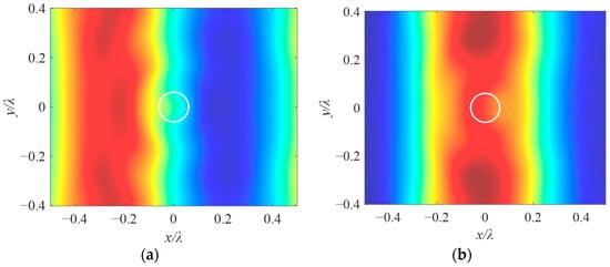 Contours of the free surface elevation on top of the submerged cylinder at a surge amplitude of 1 m, a phase of 0°, a wave amplitude of 0.4 m, and a wave period of 4 s in four uniformly distributed time instances within a wave period. The white circle on subfigures represents the location of the submerged cylinder (a) when the wave crest approaching; (b) when the wave crest arrives; (c) when the wave trough approaching; and (d) when the wave trough arrives. A phase of 0° means that the surge velocity of the submerged cylinder in the positive direction of the x-axis reaches its maximum when the wave crest arrives.