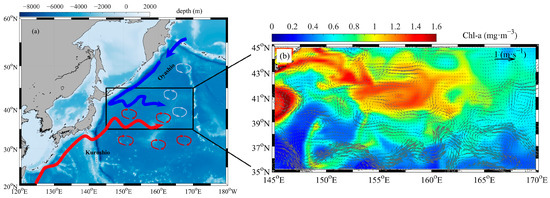 Data on the SLA and SST were obtained from the same source as the data on the currents. The daily potential temperature used to compute the mixing layer depth (MLD) was sourced from the reanalysis products provided by the dynamic model of the ocean (https://data.marine.copernicus.eu/product/GLOBAL_MULTIYEAR_PHY_001_030/services ( accessed on 7 January 2024)) at a spatial resolution of 0.083° × 0.083°. The MLD was defined as the depth of the ocean at which the density increased in comparison with that at a depth of 10 m, and corresponded to a decline of 0.2 °C in the temperature under standard atmospheric pressure [4,34]. We used data from the Kuroshio–Oyashio confluence region (145° E–170° E, 35° N–45° N) spanning from 1 January 2009 to 31 December 2022. Figure 1a illustrates the bathymetric topography and background system of currents, while Figure 1b shows the spatial distribution of sea surface currents corresponding to surface Chl-A content on 3 June 2020.