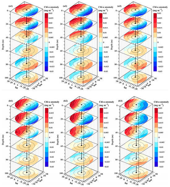 High values of positive anomalies in Chl-A (higher than 0.01 mg/m3 on the surface, 0.015 mg/m3 at a depth of 20 m, and higher than 0.01 mg/m3 at a depth of 40 m) gradually expanded from the edges of the eddy to its center at a depth shallower than 40 m from the developmental to the stable stage of evolution of CEs (Figure 3(a1–a3)). This tendency weakened in the stage of decay of CEs. The vertical distribution of positive anomalies in Chl-A expanded in a roughly counterclockwise manner in each stage of evolution of the CEs, which reflected their nonlinear rotational characteristic. The high values of positive anomalies in Chl-A at 0–40 m (higher than 0.015 mg/m3 on the surface, 0.015 mg/m3 at a depth of 20 m, and higher than 0.015 mg/m3 at 40 m) gradually expanded from the center of the eddy to its northwest edge for the ACEs (Figure 3(b1–b3)). This expansion spanned from the edge of 1R to 2R from the surface to a depth of 20 m. The anomalies in Chl-A over 3R at 60 m exhibited a more pronounced positive increase compared with those in the CEs. Moreover, the range of anomalies in Chl-A that were higher than 0.005 mg/m3 continually decreased during the evolution of the ACEs at 80–100 m, and were gradually concentrated between 2R and 3R in the southern part of the eddy.