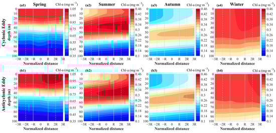 The south–north sections of Chl-A concentration along the meridians of centers of the CEs (a1–a4) and ACEs (b1–b4) in different seasons. The positive radius is directed northward and the negative radius southward. The solid and dashed lines represent the mean radius and twice the mean radius, respectively.