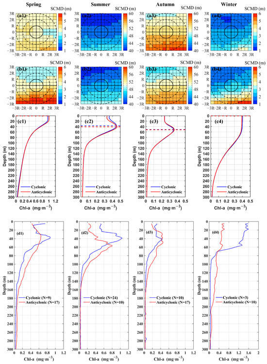 Spatial distributions of the SCMD in CEs and ACEs in different seasons. (a1–a4) show the horizontal distribution of the SCMD of the CEs, and (b1–b4) show the horizontal distribution of the SCMD of the ACEs. The solid black lines represent the mean eddy radius and the dashed black lines represent twice the eddy radius. (c1–c4) show the vertical profile of the average Chl-A concentration within the mean eddy radius. The dashed blue and red lines denote the SCMDs in the CEs and ACEs, respectively. (d1–d4) show the observed chlorophyll profiles in the eddies. “N” indicates the number of profiles.