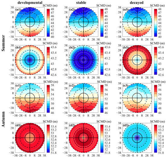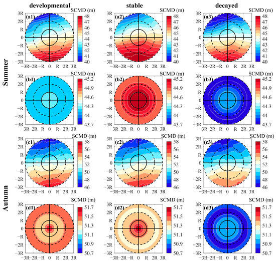 Figure 6 and Figure 7 show that the SCMD was more pronounced in summer and autumn, and exhibit the variations in the SCMD during the evolution of the eddies. The SCMD gradually became shallower from south to north during the evolution of the CEs (Figure 6(a1–a3,c1–c3)), where this is consistent with the average spatial distribution shown in Figure 5. The SCMD of the CEs decreased first and then gradually rose with the evolution of the eddies in summer, and reached the minimum depth in the stable stage (Figure 5(a,b)). It increased first and then decreased in autumn, with the largest value occurring in the stable stage of eddy evolution (Figure 6(c1–c3,d1–d3)). The high values of the SCMD on the southern side of the eddy expanded northward, from the edge of 2R–3R, from the stage of development to that of stability of the CEs in autumn. The radially averaged monopole structures reflected significant spatial disparities in the SCMD within the CEs: in summer, the SCMD was internally shallow and externally deep, with a pronounced gradient of depth that increased from the center to the edge of the eddy (Figure 6(b1–b3)). The three stages of evolution of the CEs in autumn resembled their pattern in the summer, with the SCMD being internally shallow and externally deep. Compared with those in the summer, changes in the SCMD were more pronounced at the center in autumn during the stable period (Figure 6(d2), with the contour lines of the SCMD more densely distributed within the average radius of the eddy). This was different from its pattern of increase from the center to the edge of the eddy, with its maximum value occurring between 1R and 2R. Changes in the SCMD were smaller than 10 m during the evolution of the CE within 3R. The mean SCMD ranged from 42.6 to 43.6 m in summer, and from 51.8 to 53.4 m in autumn.