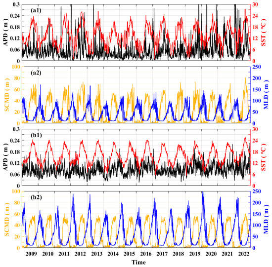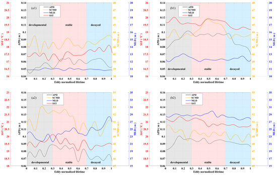 Time series of the SCMD, APD, SST, and MLD within the mean radius of the eddies on each day. (a1,a2) show the sequences of parameters of the CEs, while (b1,b2) show those of the ACEs.