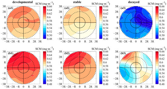 By contrast, the SCM in the CEs was lower than that in the ACEs during their evolution. It had a high value (>0.6 mg/m3) inside the CEs during their development. Once the CEs had stabilized, the corresponding SCM decreased. A low-value center (~0.49 mg/m3) was positioned about 2R east of the eddy center in the stage of decay of the CEs. Figure 10(b1–b3) show that the SCM outside the ACEs (from 1R to 3R) was higher than that at the eddy center during the stages of development and stability. When the ACEs decayed, the SCM exhibited a notable horizontal disparity that was characterized by two low-value centers in the southwest and northeast.