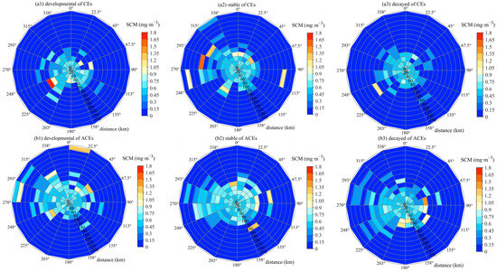 Spatiotemporal transport of the SCM by the CEs (a) and ACEs (b) during their evolution. (a1–a3) represent SCM transport during the stages of development, stability, and decay of the CEs, while (b1–b3) show the corresponding results for the ACEs. The direction of the polar coordinates was divided into 16 azimuthal angles, and the radius was assumed to be the relative distance from the eddy center.